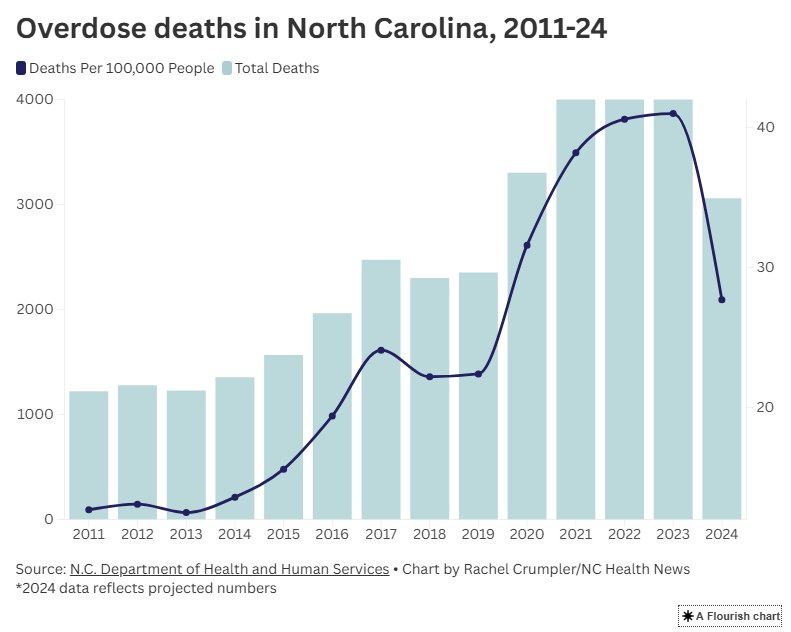 In 2024, EMS agencies across North Carolina responded to 25,389 suspected overdoses, according to data provided to NC Health News by the state Department of Health and Human Services. As of Oct. 17, North Carolina EMS agencies have responded to 17,901 such calls in 2025 so far.